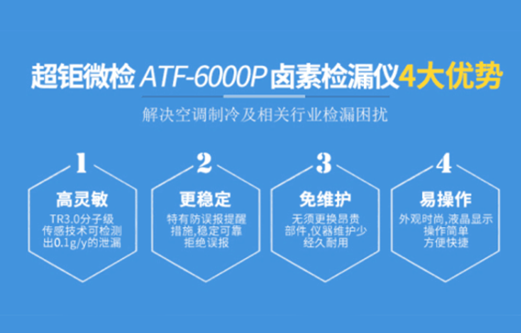 【超钜微检】经过多年的技术沉淀和积累,为制冷行业微小泄漏快速检测提供产品和系统方案一站式服务。旗下型号为ATF-6000P的国产冷媒检漏仪集快速、可靠、灵敏及易操作为一体,其采用独特的TR3.0分子级传感技术,1秒便可轻松检测微小泄漏并能精准定位,更可以量化显示具体泄漏数值!检测下限为0.1克/年,远超中国制冷行业2克/年的卤素泄漏标准!更是受到了以世界500强企业为代表的众多实力品牌用户的青睐。
