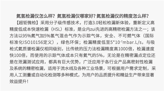 轻松保护海洋,掌握船体泄漏源!【超钜微检】氮氢检漏仪繁琐、低效成过去,黑科技颠覆油泵制造业,秒测微漏,效率翻倍!【超钜微检】氮氢检漏仪轻松抓住精密件微小泄漏真相!节省成本、效率翻倍【超钜微检】氮氢检漏仪助你一臂之力传统保压法OUT,结构件检漏工作秒响应【超钜微检】氮氢检漏仪压倒传统水检,让你告别烘干烦恼,1s恢复新品!【超钜微检】氮氢检漏仪